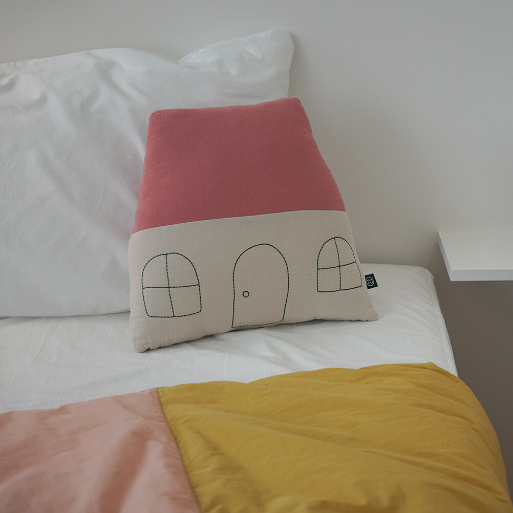 A home cushion featuring a lovely combination of muted indie pink and cream colors, reminiscent of a cozy house in a quiet countryside village.