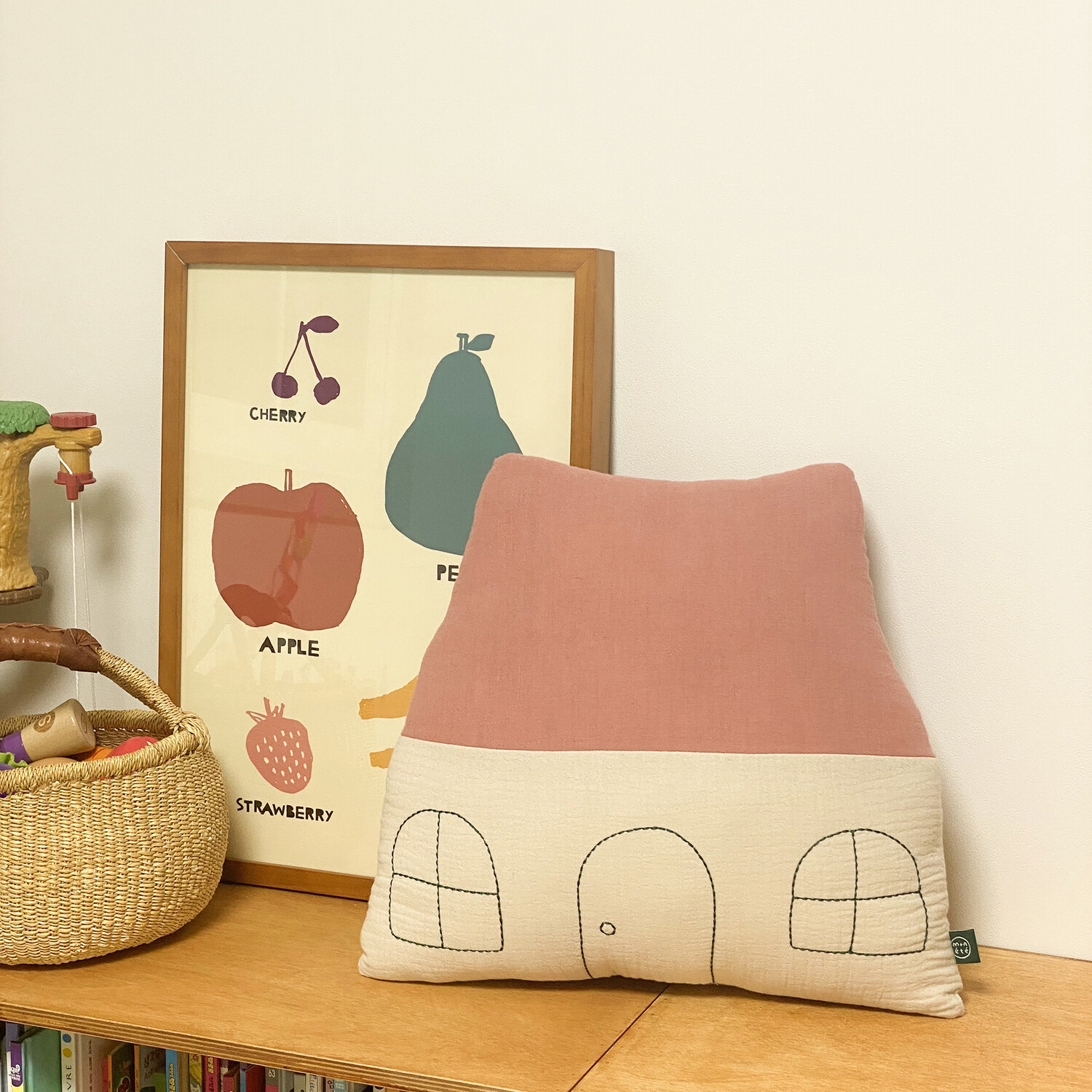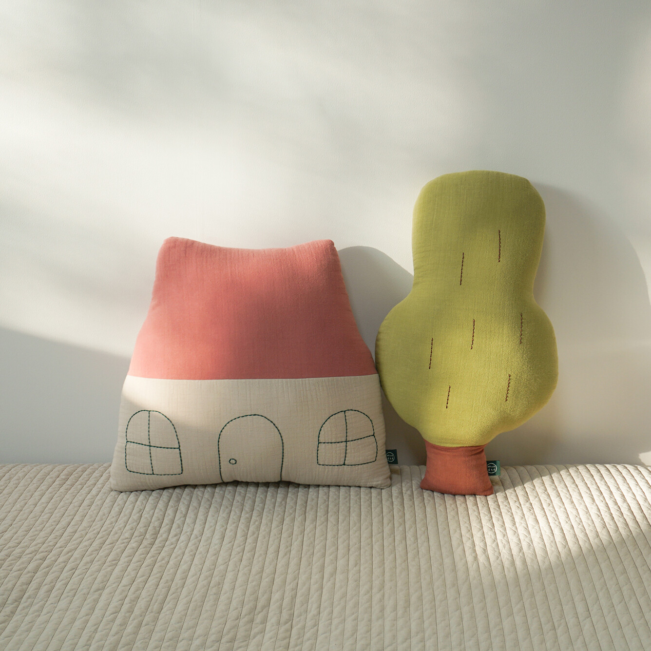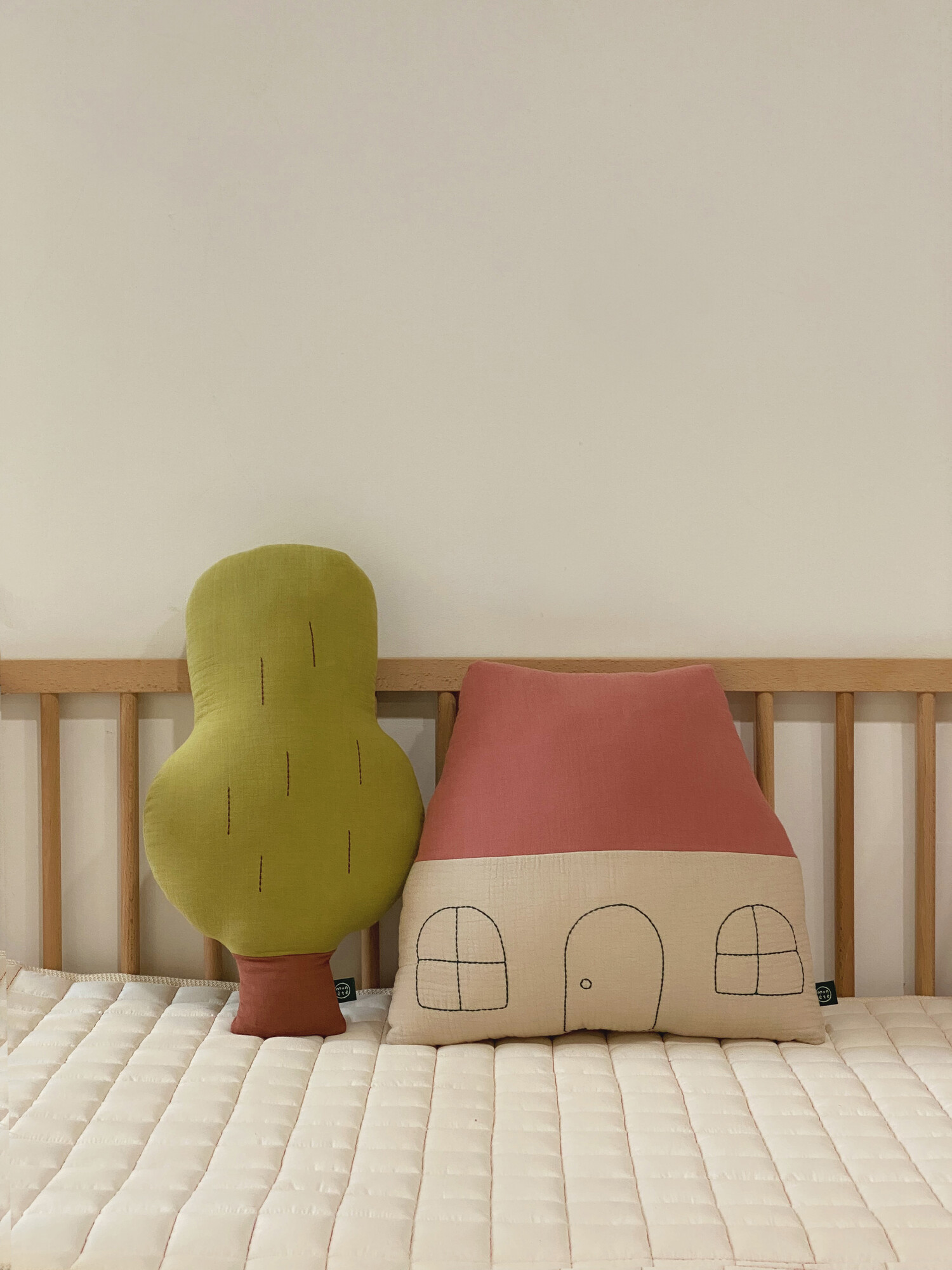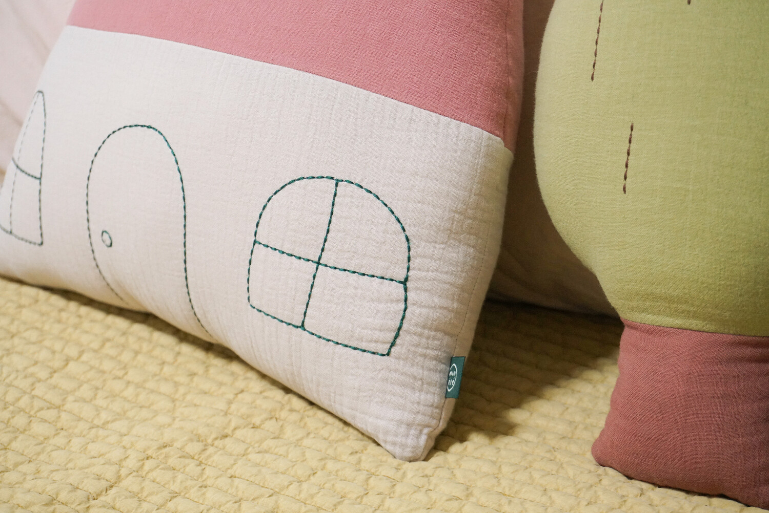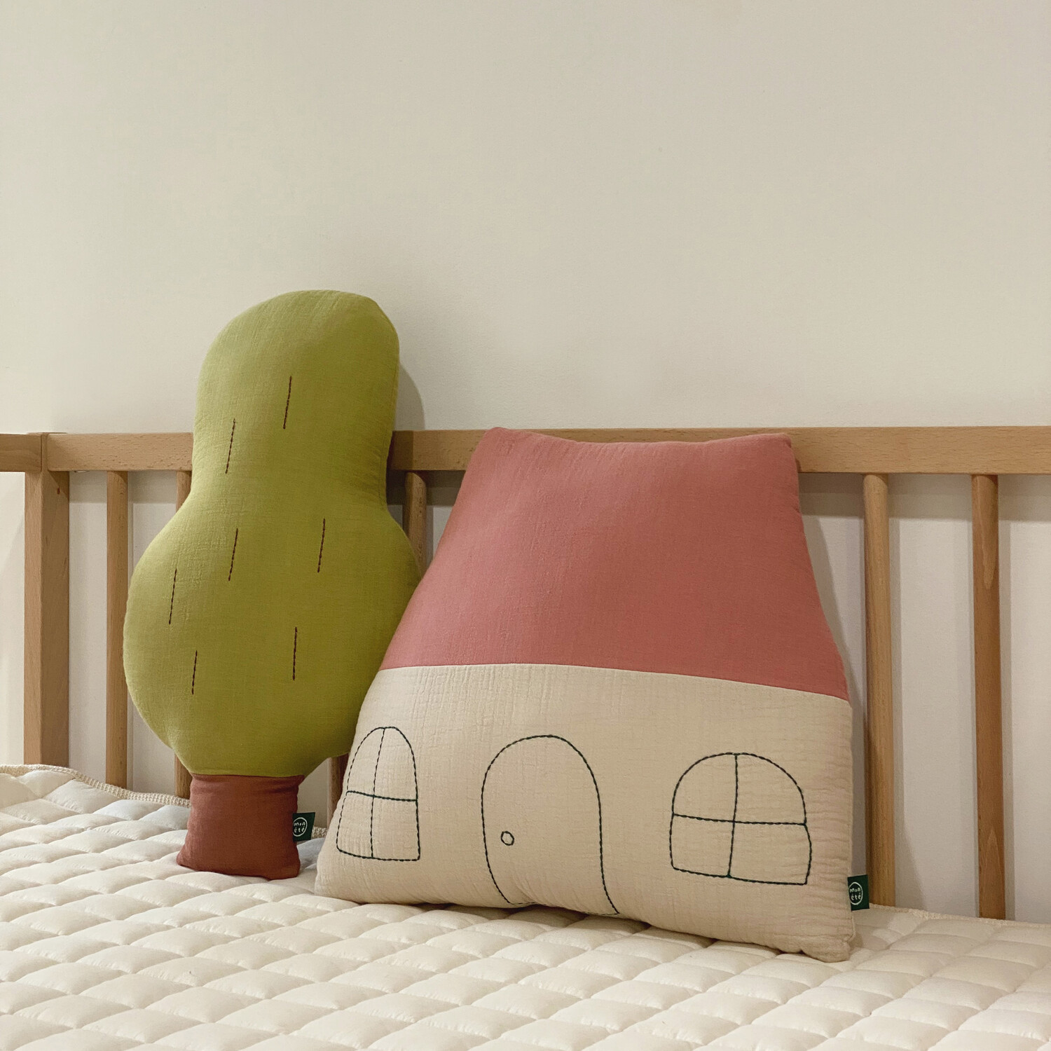 The large roof and round windows add a cute charm to the design. The windows and door drawings are highlighted with deep green stitch embroidery, making it a perfect accent piece that adds warmth to any space.