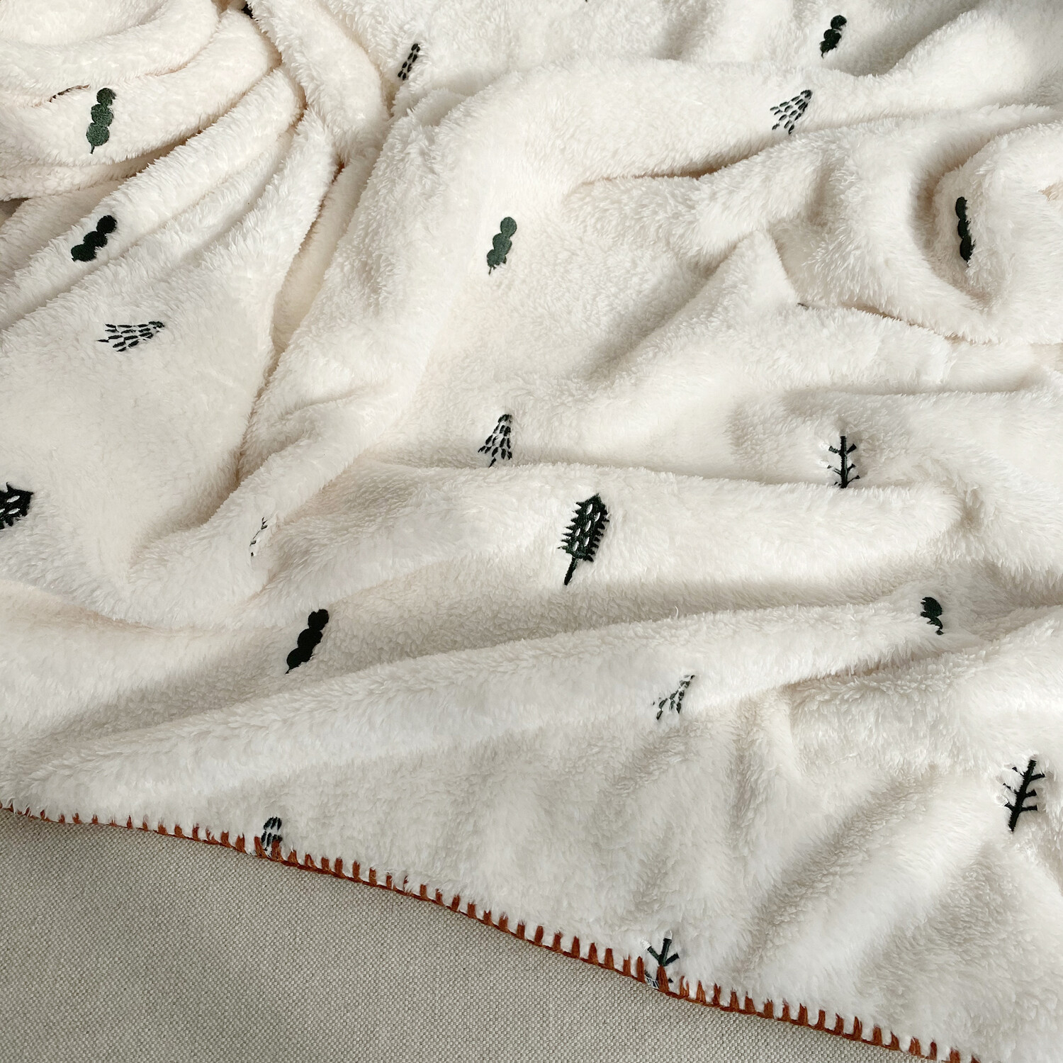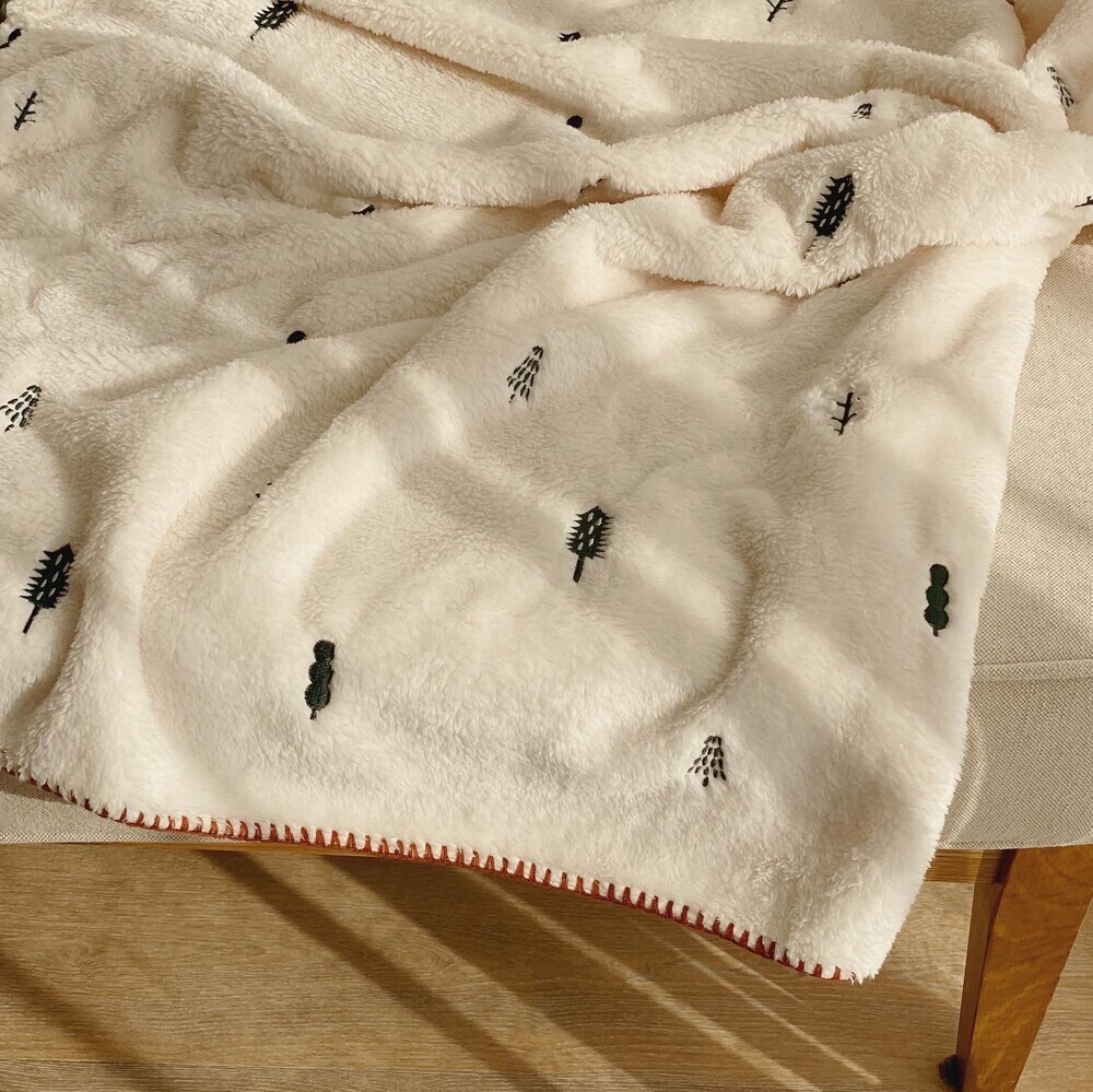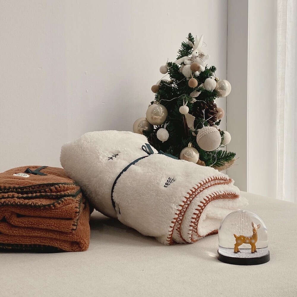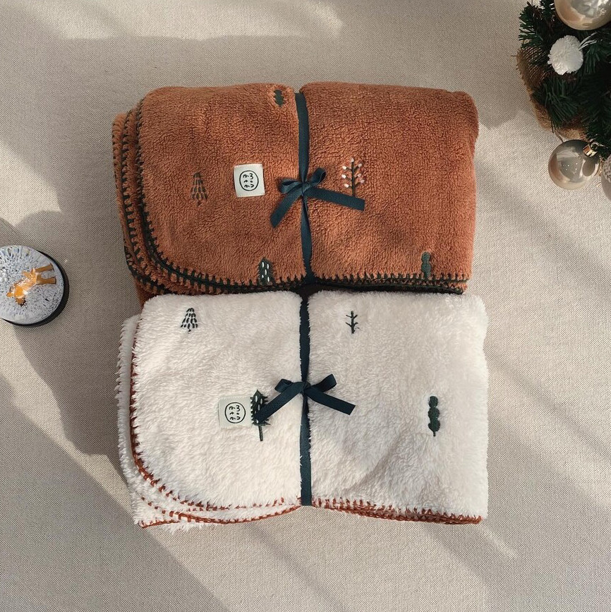 Introducing a cozy fur blanket that embodies the winter spirit. Featuring a unique Nordic forest-inspired tree pattern design exclusive to MONETE. The edges are finished with warm woolen stitching, adding a lovely touch that makes it perfect as a Christmas gift. Unlike lower-quality fur fabrics, this blanket offers a superior soft texture for comfortable use throughout winter, with a generous size suitable for both children and adults. Ideal as a lap blanket for the sofa or as a warm cover for stroller rides during outings. Available in two colors: cream and brick. The cream color evokes a snow-covered forest scene, while the brick color is an attractive reddish-brown reminiscent of a warm fireplace. Highly recommended for those seeking a lightweight yet warm blanket or a unique design beyond common embroidery patterns!