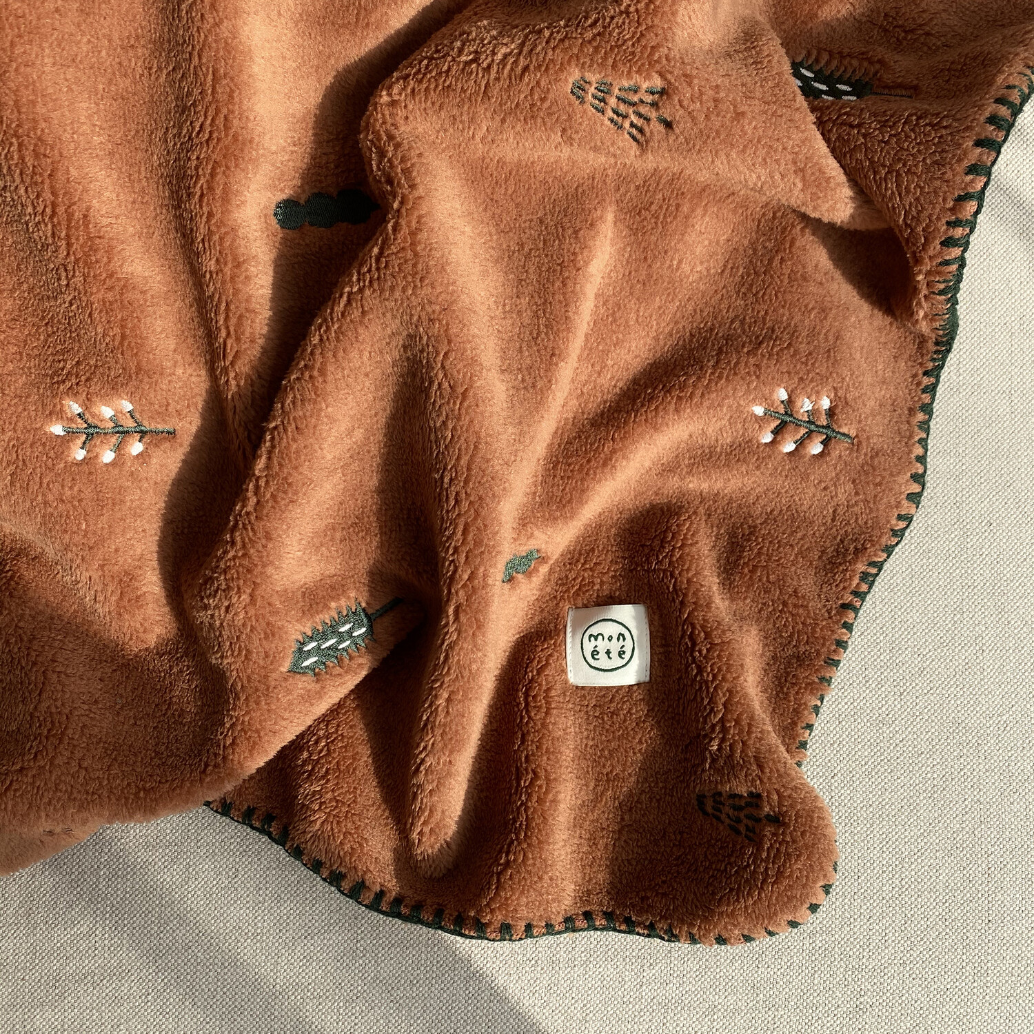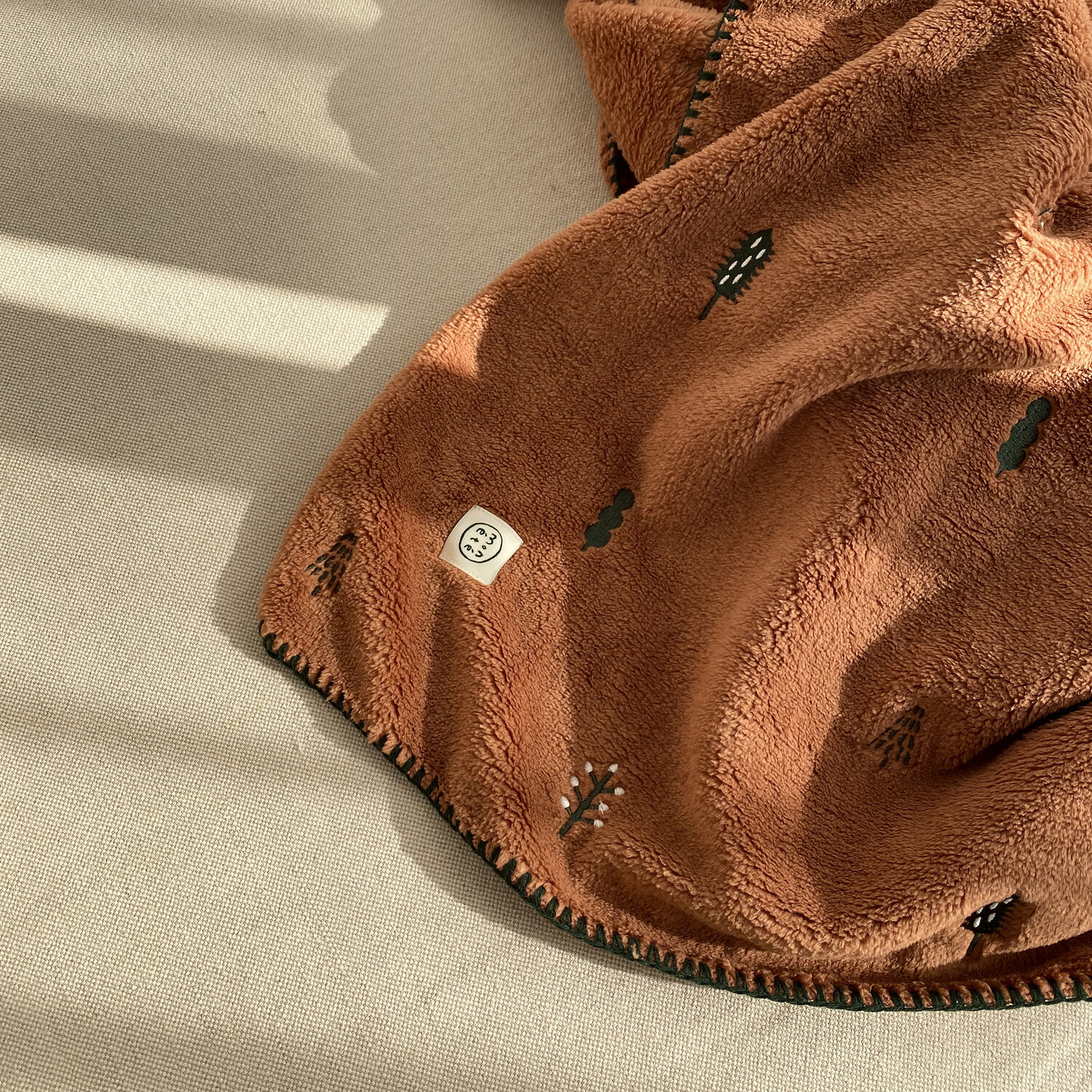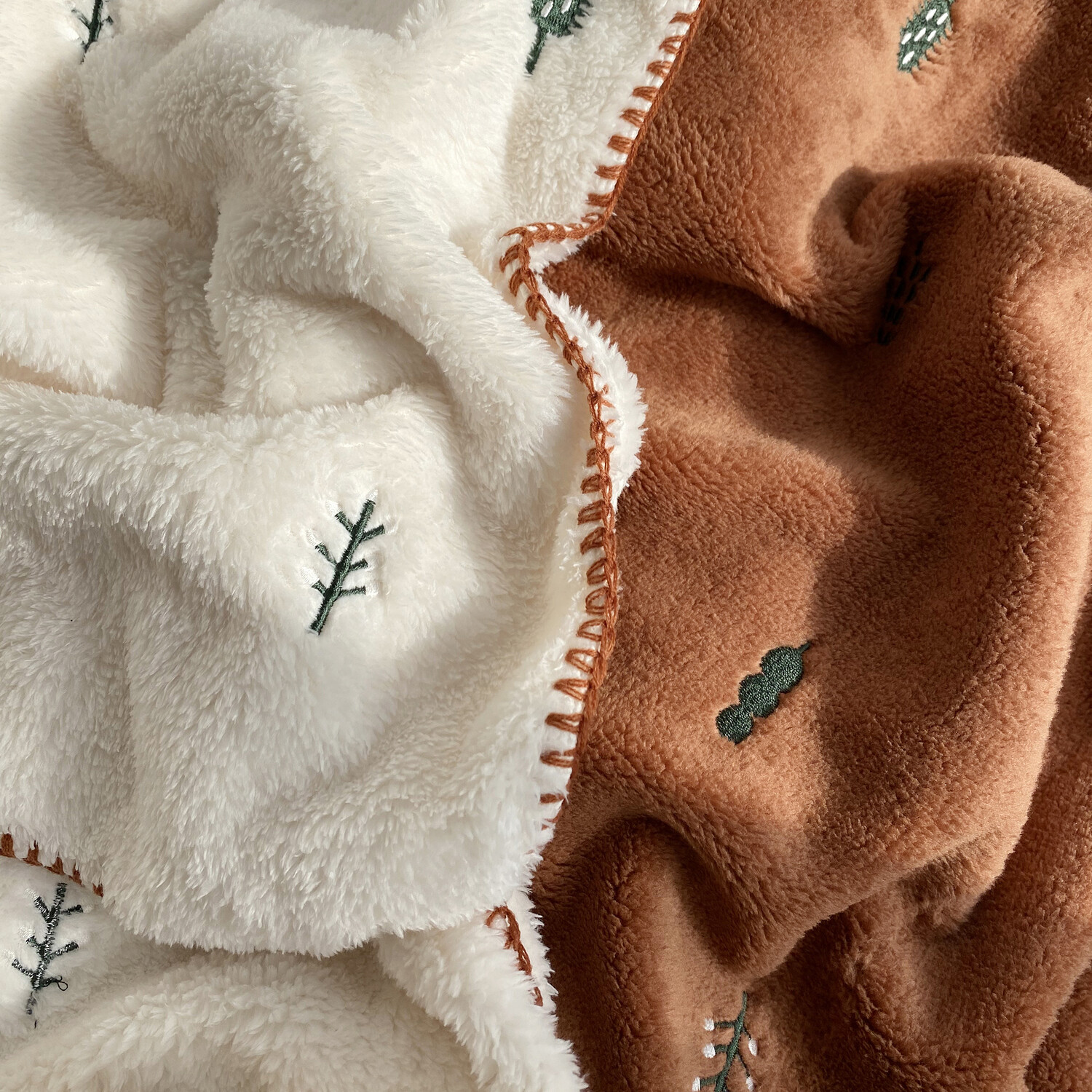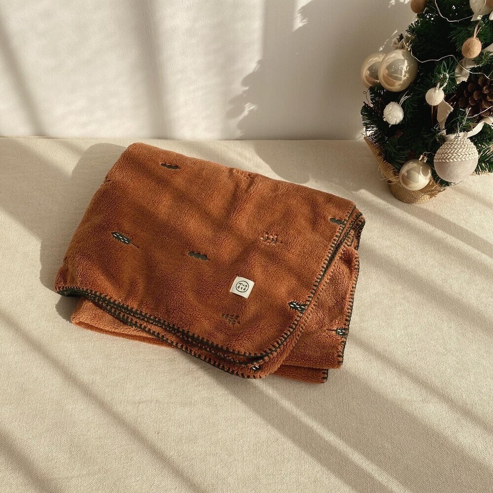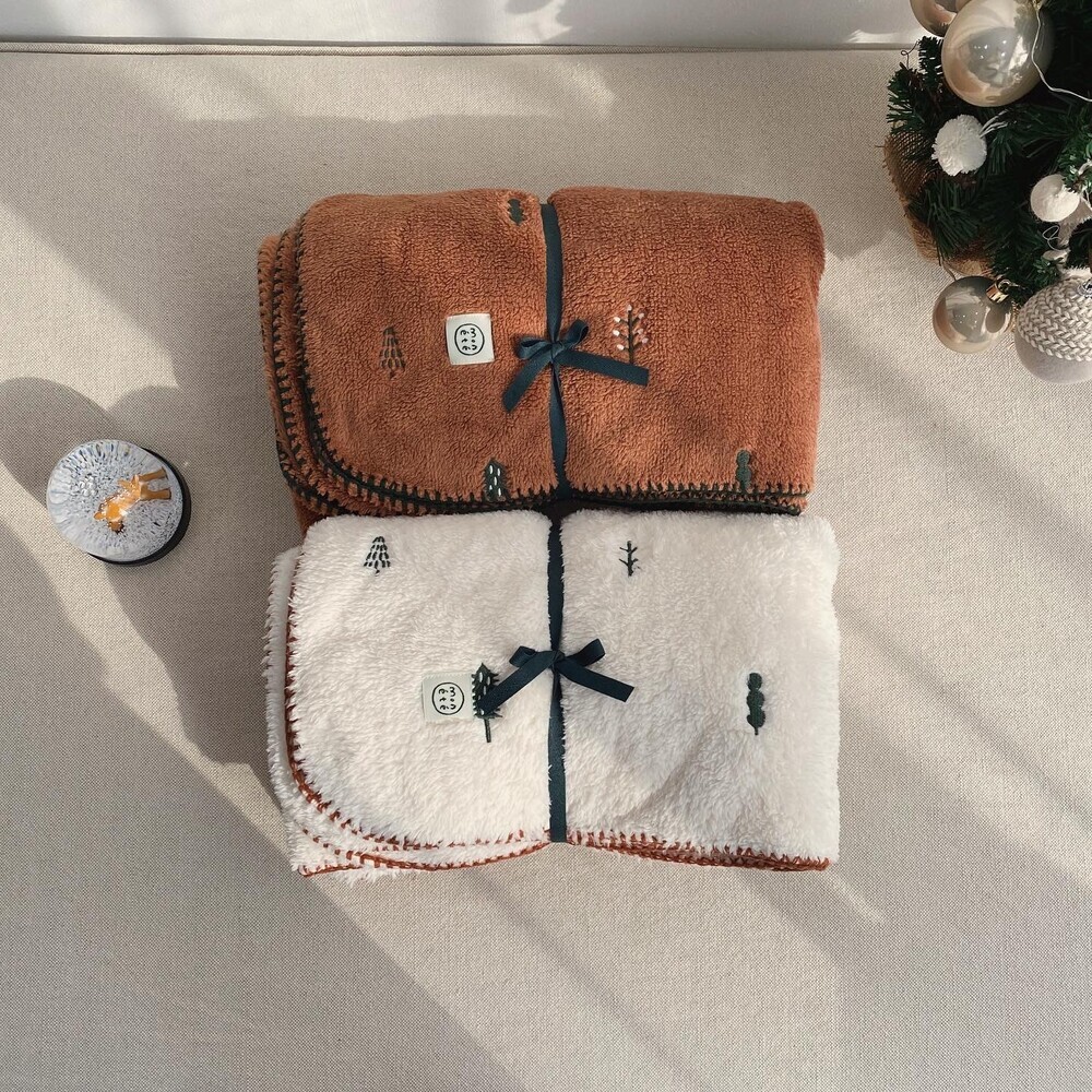 Introducing a cozy fur blanket that embodies the winter spirit. Featuring a unique Nordic forest-inspired tree pattern design exclusive to MONETE. The edges are finished with warm woolen stitching, adding a lovely touch that makes it perfect as a Christmas gift. Unlike lower-quality fur fabrics, this blanket offers a superior soft texture for comfortable use throughout winter, with a generous size suitable for both children and adults. Ideal as a lap blanket for the sofa or as a warm cover for stroller rides during outings. Available in two colors: cream and brick. The cream color evokes a snow-covered forest scene, while the brick color is an attractive reddish-brown reminiscent of a warm fireplace. Highly recommended for those seeking a lightweight yet warm blanket or a unique design beyond common embroidery patterns!